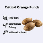 Critical Orange Punch wächst robust und vigorous mit kurzer bis mittlerer Internodal-Länge in einer straffen, produktiven Wuchsform. Die Sorte ist ein schneller Grower für eine Hybrid und blüht indoor in etwa 7-9 Wochen, normalerweise 8 Wochen. Mit hohen Erträgen von 500-650g/m² indoor ist die Sorte ertragsicherst. Outdoor erreicht die Pflanze 150-250cm Höhe mit stattlichen Ernten. Der Schwierigkeitsgrad ist anfängerfreundlich – die robuste Genetik verzeiht Fehler und ist unter verschiedenen Anbaumethoden erfolgreich. Die Sorte zeigt einen Stretch von 1,5-2x in der Blütephase.