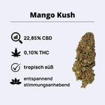 Mit einem CBD-Gehalt von rund 22,85 % bietet Mango Kush ein besonders intensives Aromaerlebnis – ganz ohne psychoaktive Wirkung. Die Sorte eignet sich perfekt für entspannte Momente im Alltag: sei es zum Abschalten nach einem langen Tag, beim Lesen oder in geselliger Runde. Das Zusammenspiel aus fruchtiger Süße und würzig-erdigem Unterton sorgt für eine angenehme Raumatmosphäre und macht die Blüte zu einem aromatischen Begleiter für bewusste Genießer.