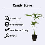 Candy Store entwickelt sich zu einer mittelgroßen Pflanze mit ausgewogener Hybrid-Morphologie und stabilen, robusten Zweigen. Die Sorte zeigt eine kräftige Hauptstruktur, die dichte, harzreiche Buds problemlos trägt. Die Pflanzen gedeihen am besten in kontrollierten Bedingungen und reagieren hervorragend auf Training-Techniken wie ScrOG und LST.